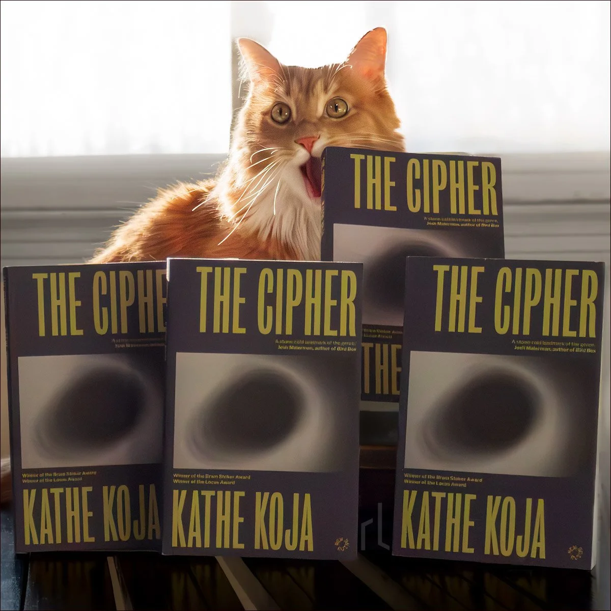 /The Funhole just keeps expanding: a new edition of THE CIPHER will be out in March from the cool curators of the darkness at Dead Ink Books. Riddle’s finding these author’s copies clearly delicious (with thanks to Rick Lieder for the feline portrait).